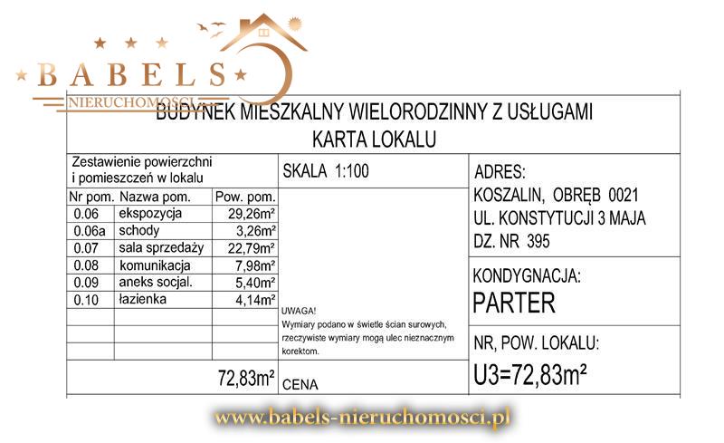 Lokal w stanie deweloperskim o powierzchni 72,83 m2 i wysokości 2,45 m usytuowany na PARTERZE w prestiżowej lokalizacji, przeznaczony pod działalność usługowo-handlową, składa się z głównego pomieszczenia usługowo-handlowego zwanego salą obsługi klienta albo salą sprzedażową, oraz pomieszczenia socjalnego - zaplecza z wc i komunikacji. Lokal wyposażony został w witrynę drzwiową (3.K3M.U)