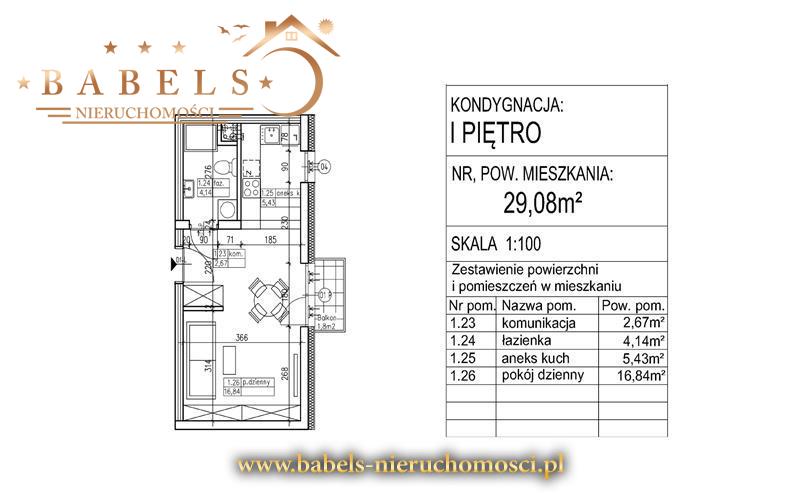 Mieszkanie w stanie deweloperskim, położone na I - piętrze w bloku z 2026r, składa się z ustawnego salonu z aneksem kuchennym - posiadającego wyjście na balkon o pow. 1,80 m2, oraz łazienki z wc i przedpokoju. Mieszkanie rozkładowe z wejściem do każdego z pomieszczeń osobno. Mieszkanie z północno - zachodnią wystawą okienną (14K3M.A)