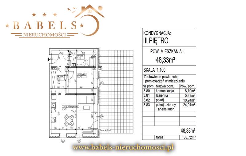 Mieszkanie w stanie deweloperskim, położone na III - piętrze w bloku z 2026r, składa się z ustawnej sypialni, salonu z aneksem kuchennym - posiadającego wyjście na duży TARAS o pow. 38,72 m2, oraz łazienki z wc i przedpokoju. Mieszkanie rozkładowe z wejściem do każdego z pomieszczeń osobno. Mieszkanie z północno - wschodnio - zachodnią wystawą okienną (30K3M.B)