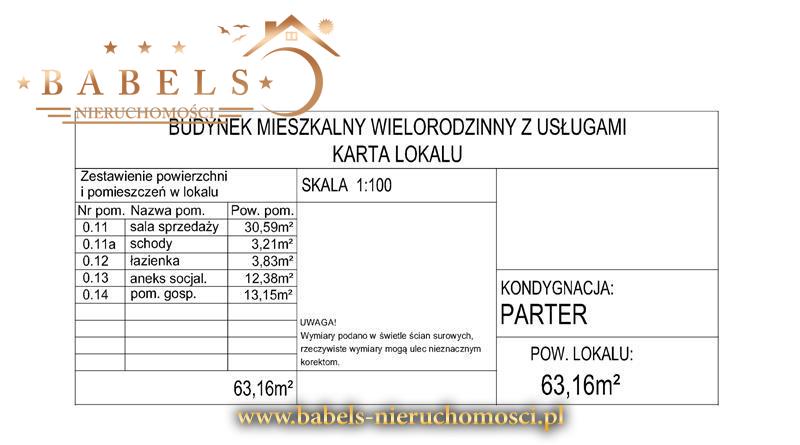 Lokal w stanie deweloperskim o powierzchni 63,16 m2 i wysokości 2,45 m usytuowany na PARTERZE w prestiżowej lokalizacji, przeznaczony pod działalność usługowo-handlową, składa się z głównego pomieszczenia usługowo-handlowego zwanego salą obsługi klienta albo salą sprzedażową, oraz pomieszczenia socjalnego - zaplecza z wc i komunikacji. Lokal wyposażony został w witrynę drzwiową (4.K3M.U)