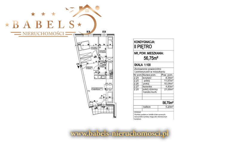 Mieszkanie o powierzchni - 56,75 m2 położone na II piętrze w nowoczesnym bloku, składa się z ustawnej sypialni, pokoju, salonu z aneksem kuchennym posiadającego wyjście na duży balkon (pow. 7,80 m2), oraz łazienki z wc i przedpokoju. Mieszkanie rozkładowe i dwustronne z wejściem do każdego z pomieszczeń osobno. Mieszkanie z południowo - północno - wschodnią wystawą okienną (16K.Z.A)