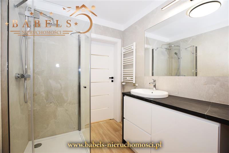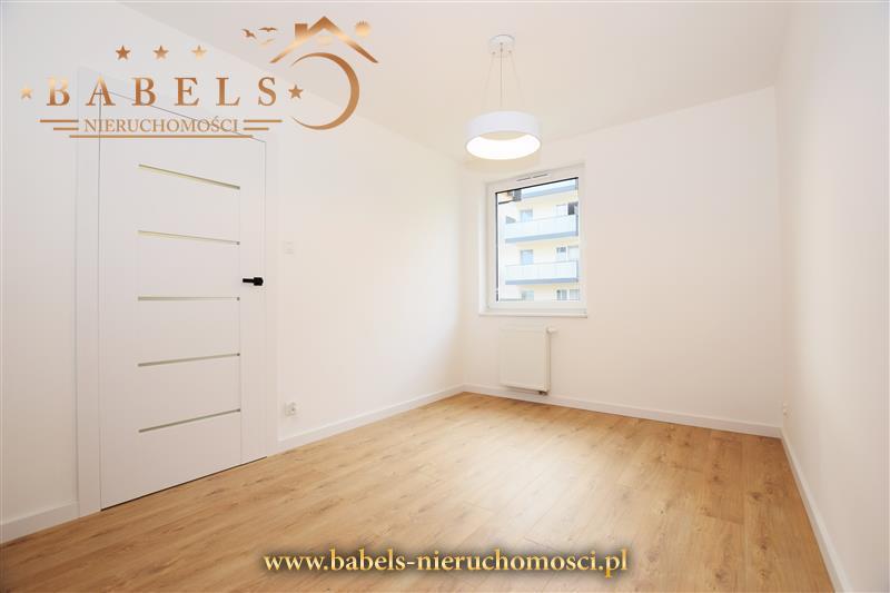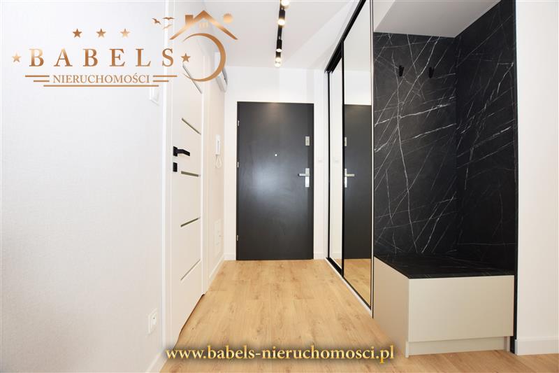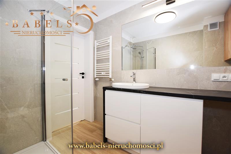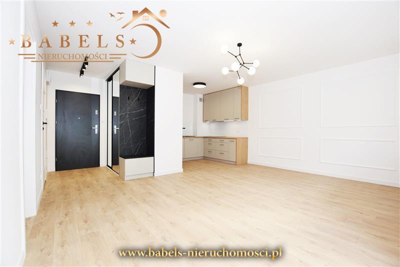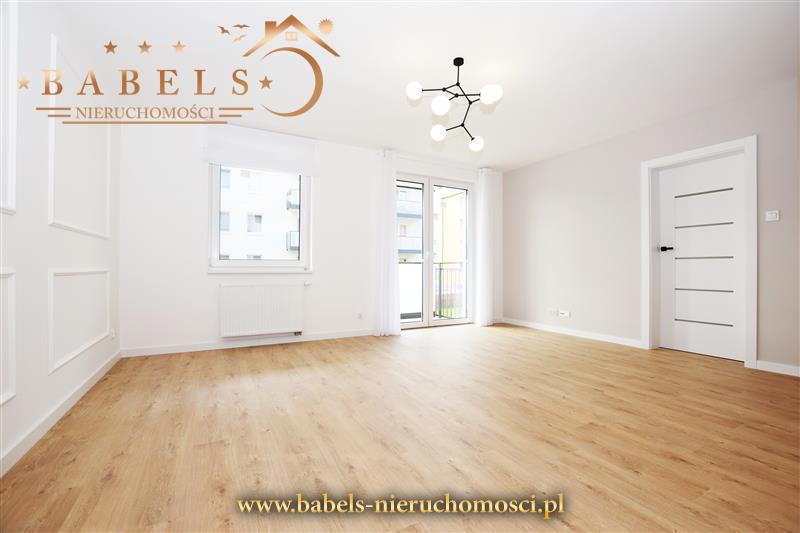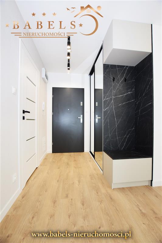 Całość zupełnie nowa, utrzymana w nowoczesnym stylu. Na podłogach panele zarówno w salonie jak i w kuchni, oraz w sypialni i przedpokoju. Natomiast w łazience kafle. Na ścianach gładzie. W przedpokoju szafa w zabudowie z siedziskiem i systemem drzwi przesuwnych posiadających lustra.