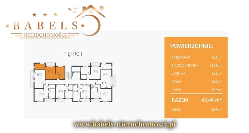 Mieszkanie w stanie deweloperskim, położone na I - piętrze w nowoczesnym bloku - apartamentowcu, składa się z ustawnego salonu z aneksem kuchennym i wyjściem na duży balkon, sypialni, oraz łazienki z wc i przedpokoju. Mieszkanie rozkładowe i jednostronne z północno-zachodnią wystawą okienną (1.J.M.1)
