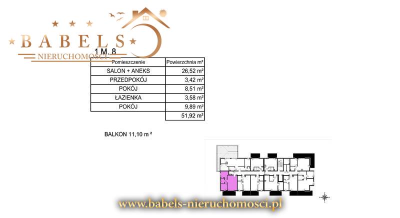 Mieszkanie w stanie deweloperskim, położone na I-piętrze w bloku - apartamentowcu z terminem ukończenia na wrzesień 2025r. Lokal składa się z ustawnego salonu z aneksem kuchennym i wyjściem na duży balkon o pow. 11,10 m2, sypialni, pokoju oraz łazienki z wc i przedpokoju. Mieszkanie rozkładowe i jednostronne z południowo - zachodnią wystawą okienną (1.M.8.)