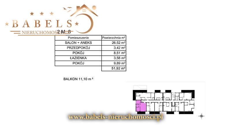 Mieszkanie w stanie deweloperskim, położone na II-piętrze w bloku - apartamentowcu z terminem ukończenia na wrzesień 2025r. Lokal składa się z ustawnego salonu z aneksem kuchennym i wyjściem na duży balkon o pow. 11,10 m2, sypialni, pokoju oraz łazienki z wc i przedpokoju. Mieszkanie rozkładowe i jednostronne z południowo - zachodnią wystawą okienną (2.M.8)
