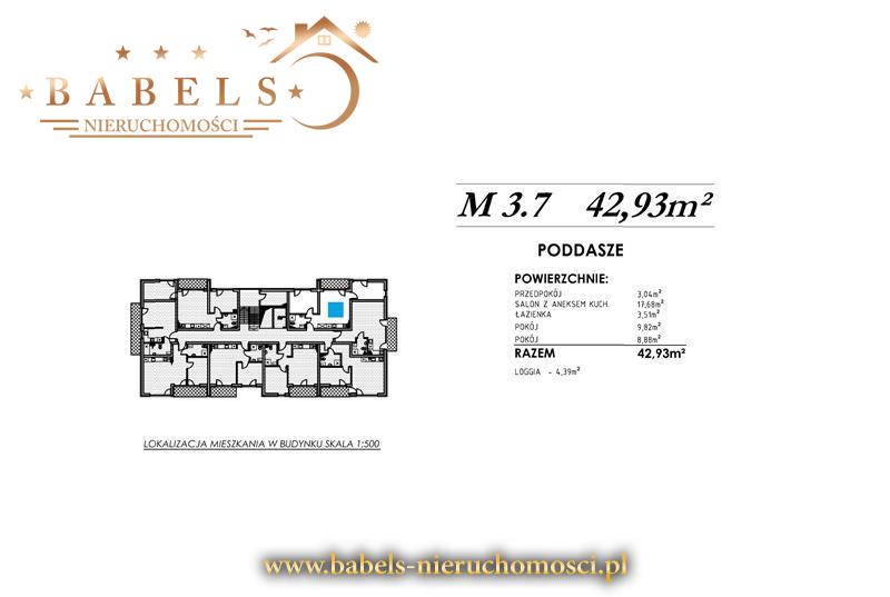 Mieszkanie o powierzchni użytkowej 42,93m2 a całkowitej 47,50m2, położone na III - piętrze w nowoczesnym bloku z windą, składa się z ustawnego salonu z aneksem kuchennym oraz wyjściem na dużą Loggię o pow. 4,39m2, dwóch sypialni w tym jednej z przestronną antresolą, a także łazienki z prysznicem i wc, oraz przedpokoju. Mieszkanie rozkładowe i jednostronne z północno-wschodnią wystawą okienną (7P.M.3)